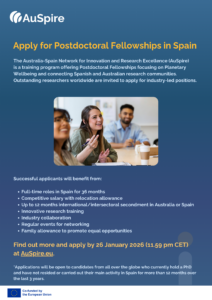 The Australia-Spain Network for Innovation and Research Excellence (AuSpire) program is a postdoctoral training initiative co-funded by the European Union (Marie Skłodowska-Curie Actions). Coordinated by RMIT Europe, AuSpire brings together leading supervisors from 23 research centres, companies, and universities.